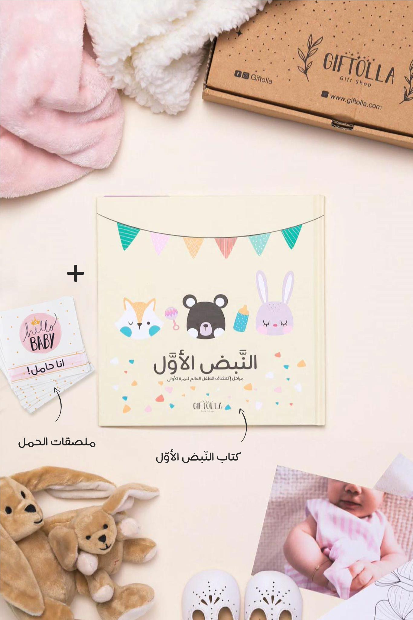 احتياجات المولود الجديدة 🥰 اصبحت بمتناول يدك وباللغة العربية احصلي على المجموعة شاملةً "كتاب النبض الأول وملصقات الحمل" لتوثقي كل مرحلة من مراحل حملك وتطوره بصورة سهلة، بالإضافة الى الكتاب الذي يوثق مراحل نمو طفلك خلال عامه الأول.😍